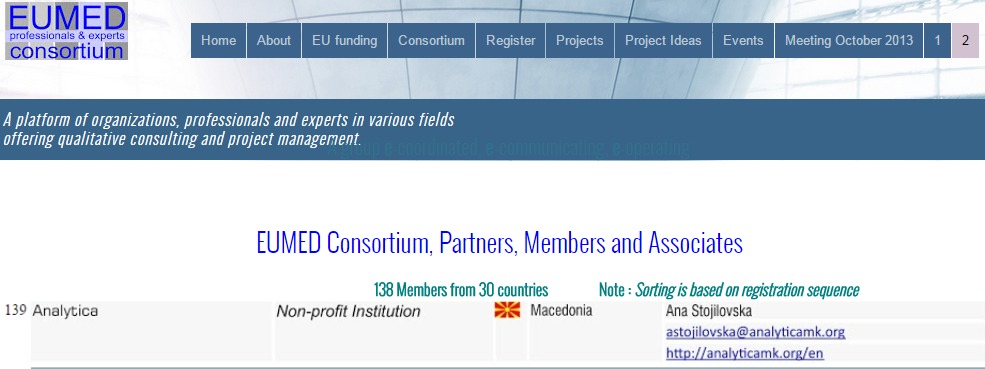 Analytica is now registered as an Associate member of the EUMED (Euro-Mediterranean) Consortium of experts and professionals which is an initiative to bring together professionals and experts in various disciplines, to actively participate in EU funding programs and projects.
