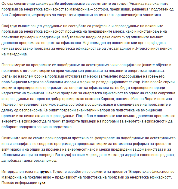 Coverage of the launch of the policy report “Analysis of the local energy efficiency programs in Macedonia – situation, challenges, solutions”